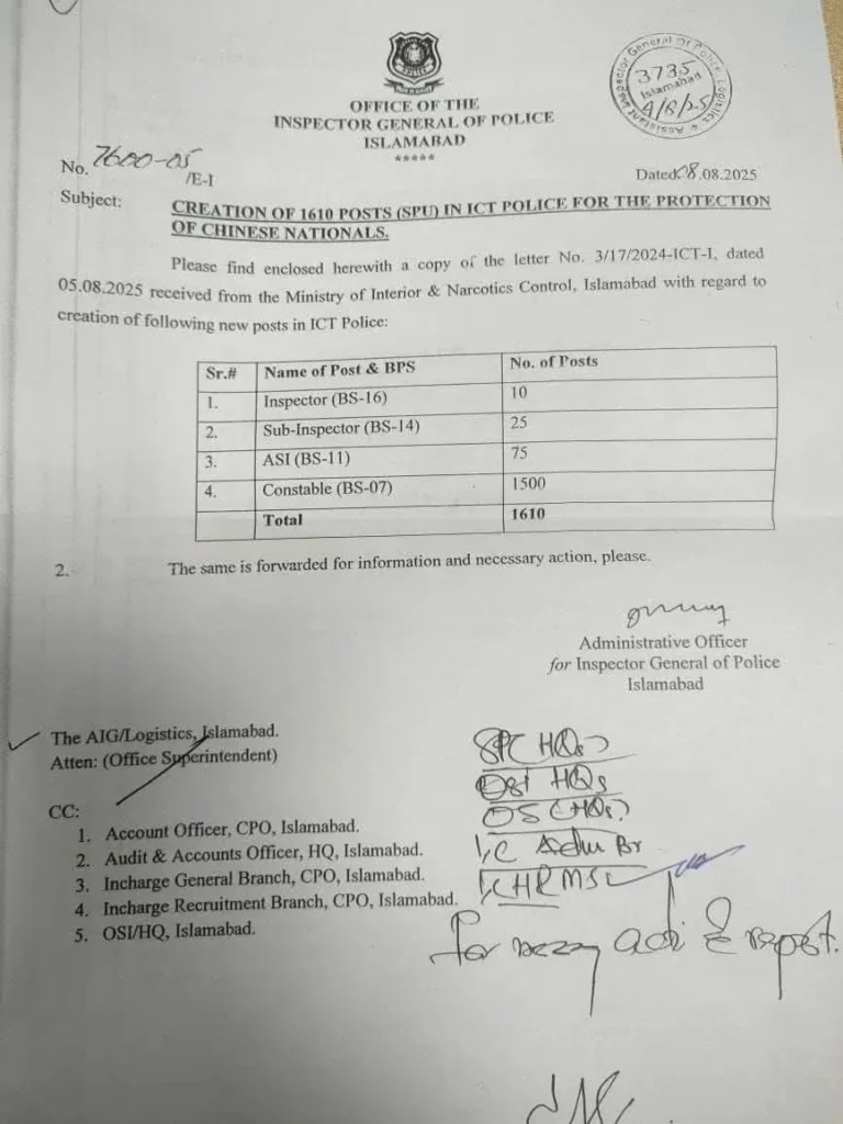 According to an official notification issued by the Office of the Inspector General of Police, Islamabad, these newly approved positions will soon be filled through a formal recruitment process. The initiative is part of the government’s broader commitment to safeguarding foreign nationals, especially those associated with key projects under the China-Pakistan Economic Corridor (CPEC).
