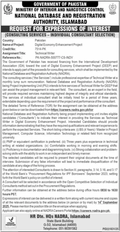 The Government of Pakistan, Ministry of Interior and Narcotics Control, through the National Database and Registration Authority (NADRA), Islamabad, has announced an exciting career opportunity under the Digital Economy Enhancement Project (DEEP). Applications are invited from qualified individuals for the position of Technical Writer on a consultancy basis.